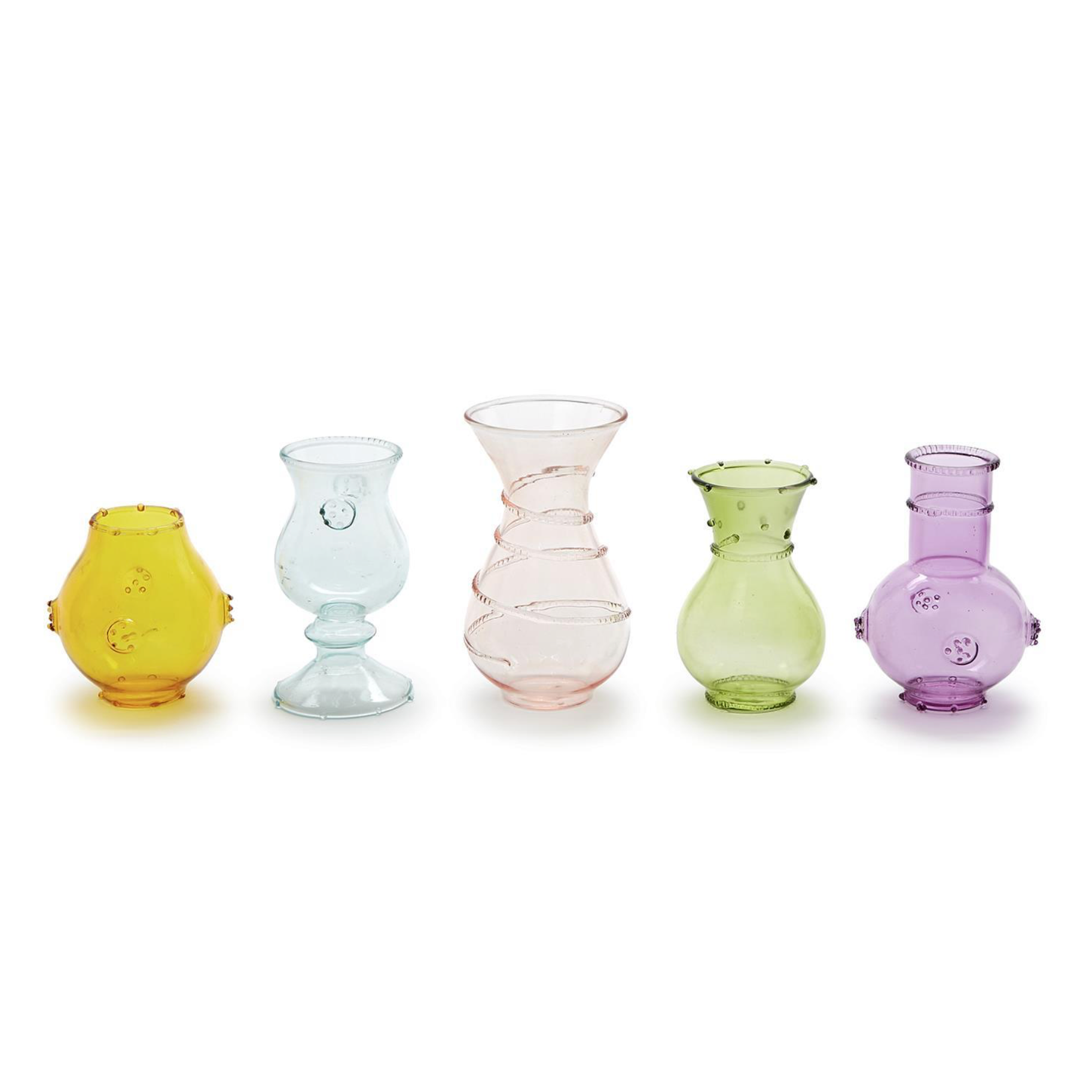 Add a pop of color and elegance to any room with Verre Set of 5 Hand-Blown Bud Vases. Hand-crafted with care, each vase showcases a unique blend of colors: Green, Blue, Purple, Pink, and Yellow. These vases are perfect for displaying your favorite blooms or even as standalone decorative pieces.