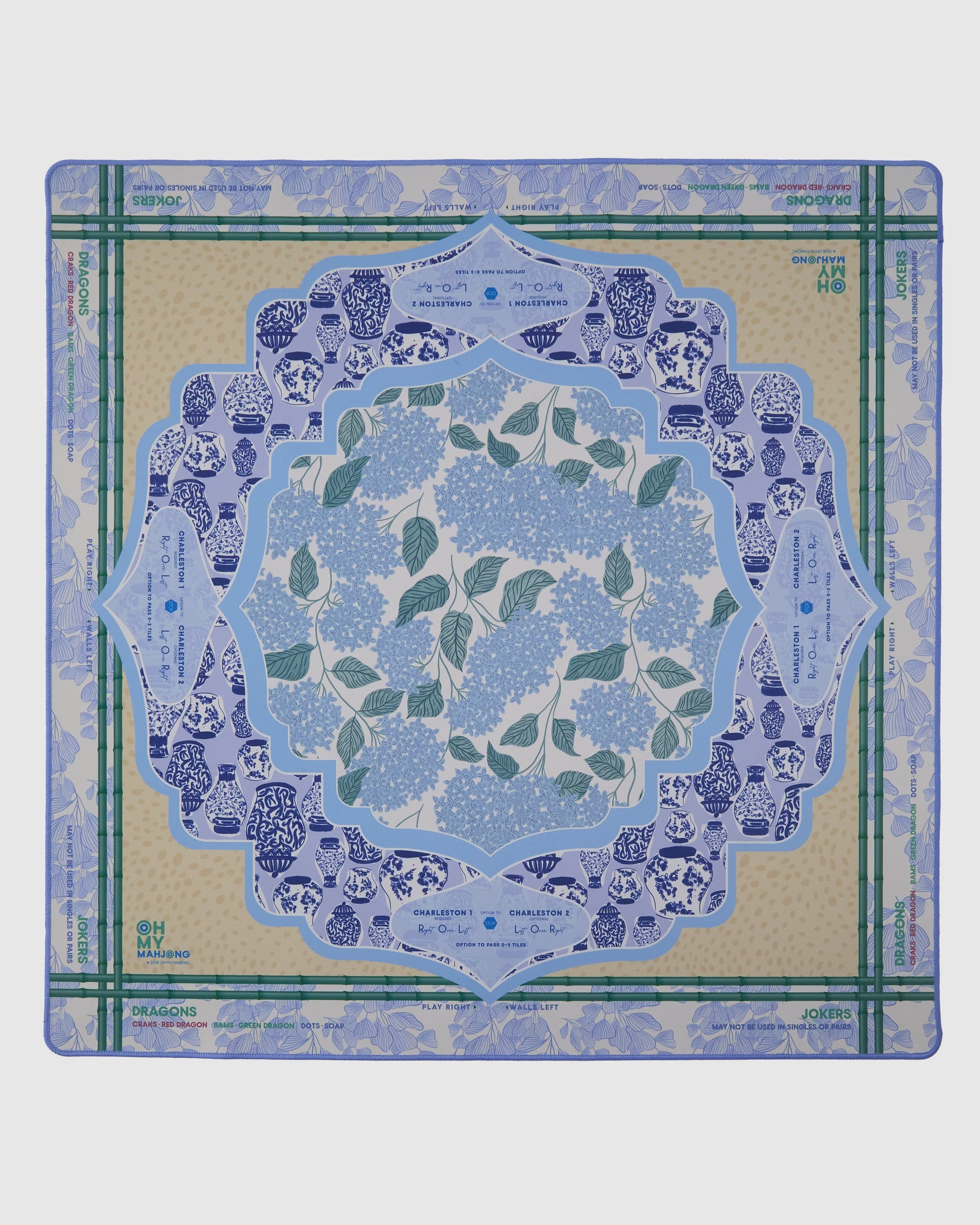 Introducing the Luna Mat — a serene yet statement-making addition to your Mahjong setup, designed for those who love timeless elegance with an artful twist. Awash in calming shades of blue and green, this mat beautifully blends hydrangea blooms, classic ginger jars, and a subtle antelope print for a look that’s equal parts coastal chic and heritage inspired. It’s sophisticated, layered, and quietly luxurious — the kind of pattern that feels right at home in your garden room, beach house, or candlelit game night setting.