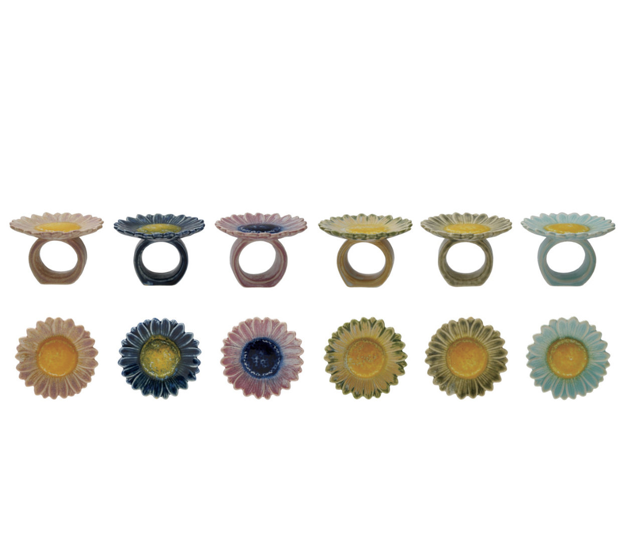 Handcrafted stoneware napkin rings featuring organic floral designs. This set of six pieces showcases natural color variations inherent to artisanal pottery production. Each ring is individually made, ensuring unique character while maintaining functional elegance for your table setting.
