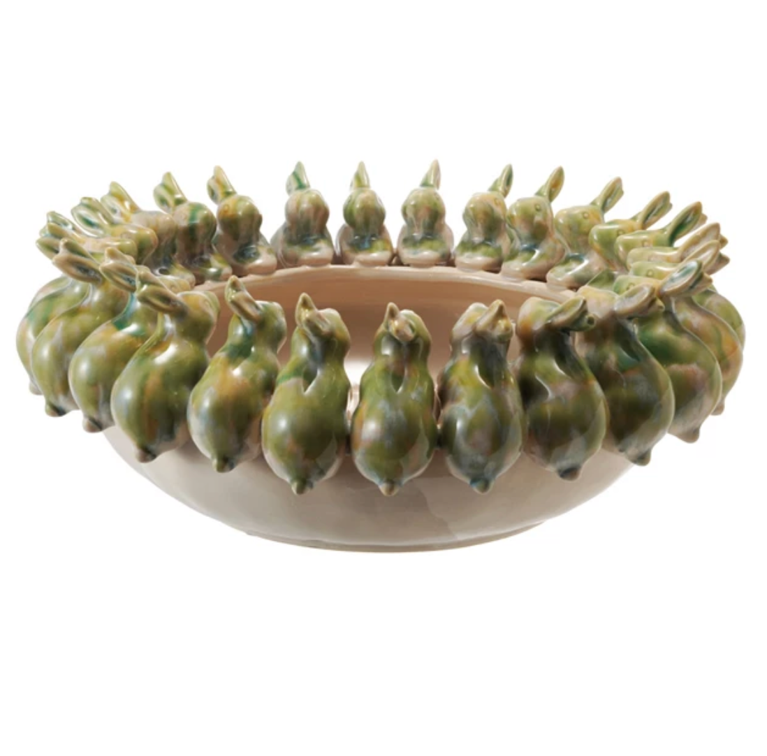 Hand-crafted stoneware rabbit bowl featuring artisanal ceramic construction with naturally occurring glaze variations that make each piece distinctly individual. Perfect for spring gatherings and Easter displays, this functional yet decorative bowl celebrates the season with rustic charm and authentic craftsmanship.