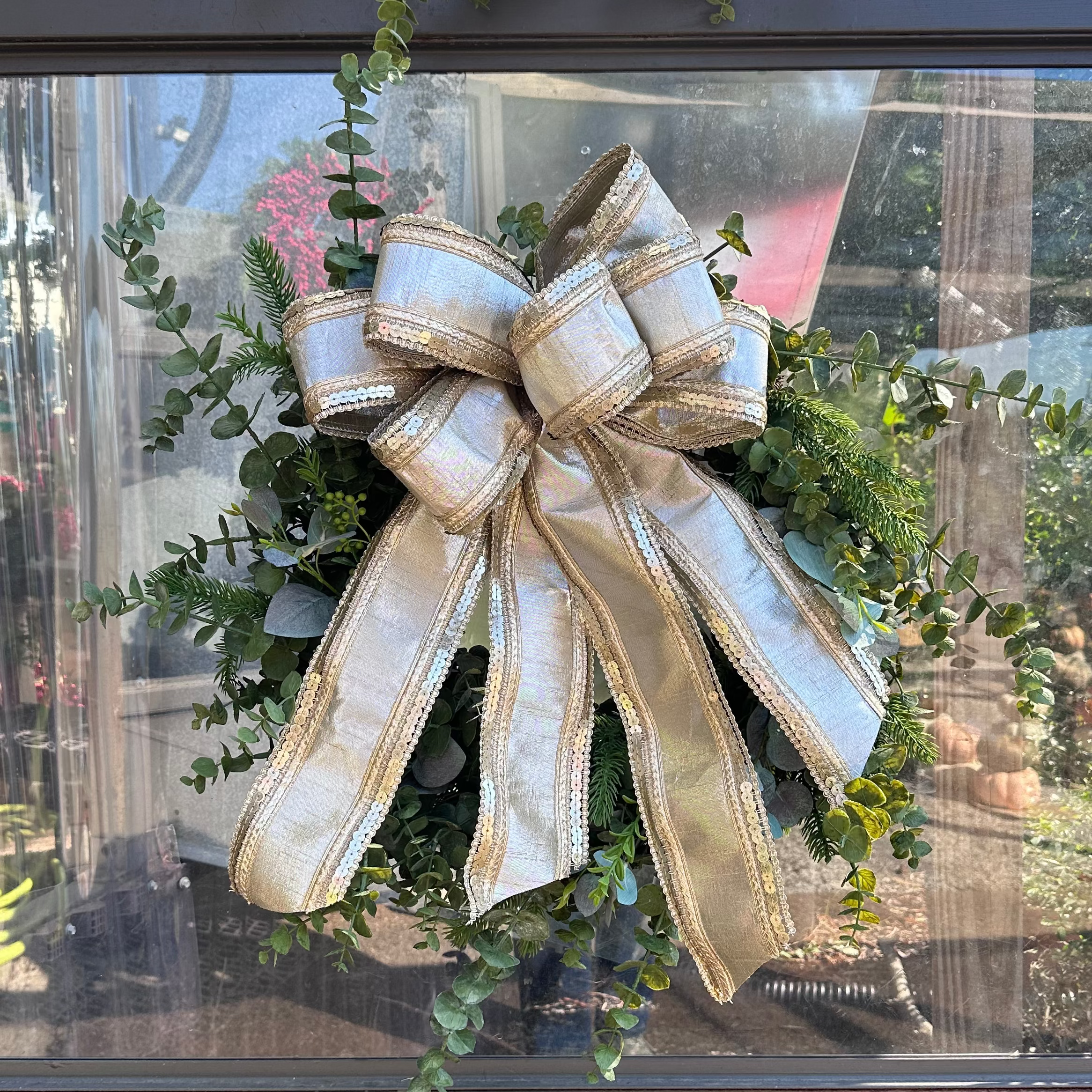 Elevate your decor with the SEQUIN SCALLOPED BOW, featuring a luxurious platinum finish and delicate scalloped edges. This expert-crafted bow adds a sophisticated shimmer and refined texture, perfect for enhancing special occasions or upscale gift presentations. Its unique sequin detailing catches light beautifully, creating a striking visual impact that complements any elegant setting.