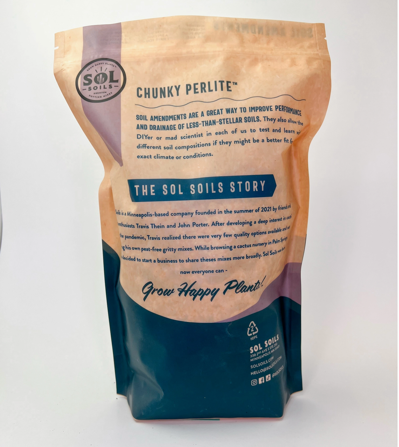 Sol Soils offers a variety of high-quality soils, soil components, and soil toppers designed for potted cacti, succulents, and houseplants. We select and hand-mix the best ingredients to produce fast draining soils that help protect against root rot, the number one killer of indoor plants. Chunky Perlite is a large and super lightweight, naturally occurring volcanic glass. When heated to the appropriate temperature during processing, it expands like popcorn. As a soil amendment perlite keeps mixes lighter and allows water to flow through. Popular with many leafy plants and orchids especially.