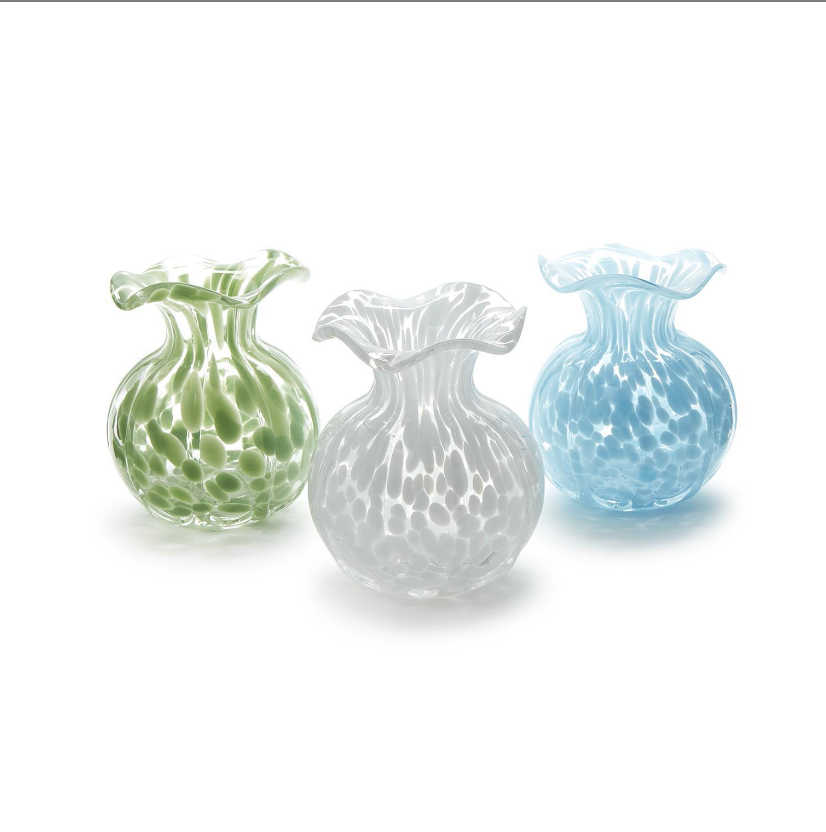 Elevate your floral arrangements with the elegant Ruffled Edge Spotted Vase.. Crafted from delicate glass, adding a pop of color to any space. Standing at 6 1/4" tall with a 5" diameter, it's the perfect vessel for your favorite blooms.