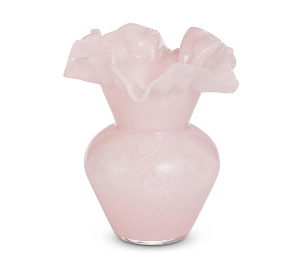 This handmade vase showcases delicate ruffled edges in a soft pale pink finish, measuring 8.75 inches tall. Each piece is individually crafted, ensuring unique variations in form and glaze. Perfect for displaying fresh or dried florals, this versatile vessel brings understated elegance to any interior setting.
